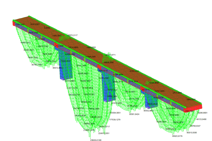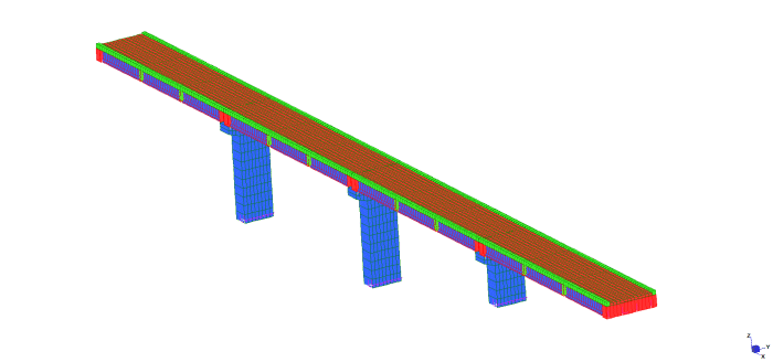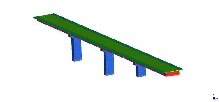 A finite element model of the bridge was created by using the commercial finite element software Straus7® (Figure 2). The outcomes of an in situ experimental campaign were used to define the geometry of the BEAM and PLATE elements, as well as the mechanical properties of the materials, the internal and external constraints. The OFFSET attribute was used to properly place the elements corresponding to the bridge slab and girders. Dynamic modal analyses (Figure 3) were carried out to calibrate the model on the basis of the experimental frequencies values, while linear static analyses (Figure 4) were used to assess the load-carrying capacity of the bridge under the load combinations of the current Italian regulations. Such loads were applied per unit area or unit length for the PLATE and the BEAM elements, respectively. A new finite element model of the bridge widened by the SUREBridge technique (Figure 5, Figure 6, and Figure 7) was then created to evaluate the increased load-carrying capacity of the refurbished structure. |