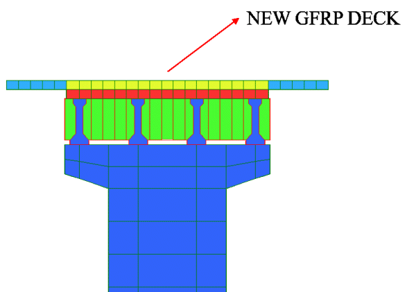The European research project SUREBridge (Sustainable Refurbishment of Existing Bridges) is developing a new concept for the structural strengthening of road bridges. According to the proposed technique, glass fibre-reinforced polymer (GFRP) sandwich panels are installed on top of the existing concrete slab and pre-stressed carbon fibre-reinforced polymer (CFRP) laminates are adhesively bonded to the bottom surfaces of the longitudinal girders (www.surebridge.eu).