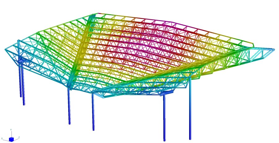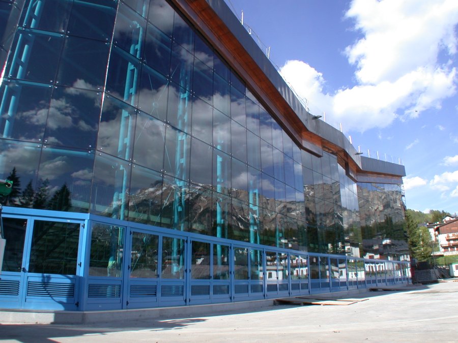 Lo stadio olimpico di Cortina era stato costruito in occasione delle VII olimpiadi invernali del 1956, con una forma ad U che copriva tre piani di gradinate per gli spettatori, lasciando il campo per le attivita' sportive su ghiaccio interamente scoperto. Il progetto realizzato nel 2003, ha permesso di coprire senza colonne intermedie il campo (circa 3400m2 di superficie) con colmi, impluvi, pendenze concordi con la copertura esistente delle gradinate senza peraltro appoggiarsi ad essa. Cimolai ha costruito e montato tutte le strutture metalliche della copertura reticolare e della facciata sud. Lo studio dell'ing. Giorgio Romaro ha utilizzato il codice di calcolo Straus7 per realizzare il modello FEM completo della struttura metallica per tutte le verifiche di resistenza e di buckling in esercizio e per seguire le principali fasi di montaggio. Testo, foto e immagine del modello di calcolo per gentile concessione di Cimolai Spa. |