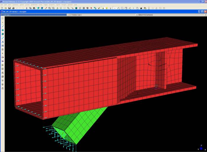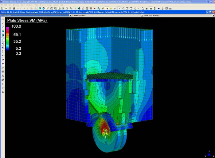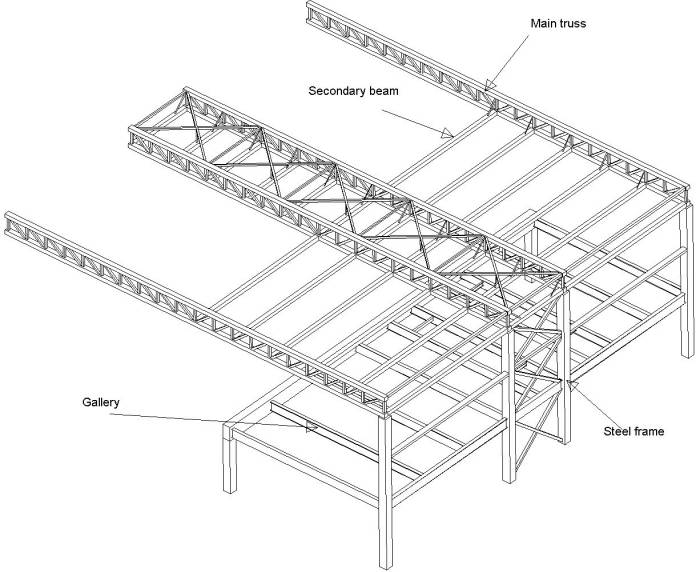 For the statical analysis of structure, a three-dimensional beam and plate model is made. The model contains all elements of the structure except the moving part of the roof, which is simulated by groups of concentrated forces.