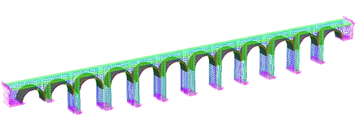 Il progetto descrive il calcolo svolto relativamente al viadotto ferroviario “Farfa” al km 44+140 LL Roma-Chiusi, al fine di valutare la capacità della struttura nei confronti delle azioni sismiche e relative ai ponti di categoria A, sia in condizione attuale che in condizione rinforzata con materiale composito PBO-FRCM, applicato all’intradosso dell’impalcato. Sulla struttura sono stati considerati, alternativamente, il modello di carico LM71 ed il modello di carico D4. Complessivamente il viadotto è stato modellato utilizzando elementi brick (12160 bricks e 16865 nodi), con condizioni di vincolo in fondazione ed in corrispondenza delle spalle. |