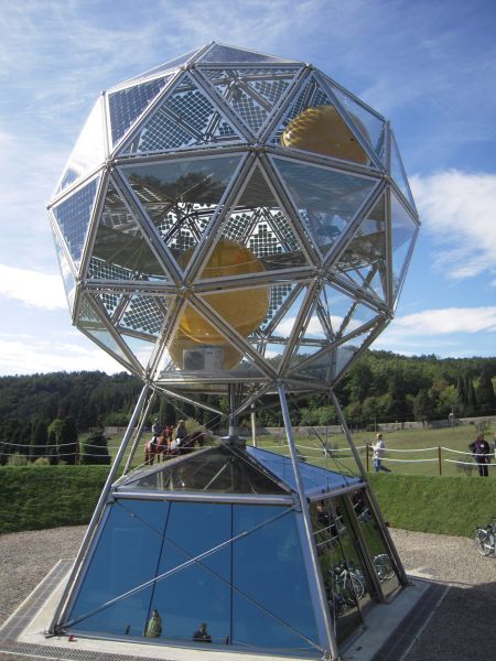 1. Breve descrizione - Diamante è il nome attribuito ad un prototipo di mini-centrale elettrica nella quale l’energia radiante solare viene trasformata in energia elettrica per mezzo di pannelli fotovoltaici opportunamente disposti sulla superficie di una sfera reticolare in acciaio posta ad una certa altezza dal suolo. La centrale ha la peculiarita', rispetto a un normale impianto fotovoltaico, di immagazzinare l'energia in appositi serbatoi sotto forma di ioni di idrogeno che alimentano batterie al litio. La sfera geodetica misura 4,0 m di raggio ed il suo centro è sostenuto a 7,63 m di altezza dal piano di imposta da una struttura reticolare sottostante all’interno della quale è situata la sala apparati. La sfera è formata da aste in acciaio inossidabile AISI 316L, di sezione circolare CHS 101.6x4 e lunghezza rispettivamente 2,472 m e 2,186 m, e da nodi sferici pieni di diametro 132 mm, in acciaio AISI 303. L’involucro del Diamante è costituito da 80 pannelli in vetro alloggiati nelle maglie triangolari del reticolo strutturale, di questi 38 saranno utilizzati per la produzione di energia mediante l’inserimento di celle fotovoltaiche nel materiale di interfaccia. Ciascun pannello è costituito da due lastre di vetro stratificato extralucido temperato chimicamente e spesso 10+6 mm, con interposto uno strato di PVB (polivinilbutirrale) di 1,52 mm di spessore.