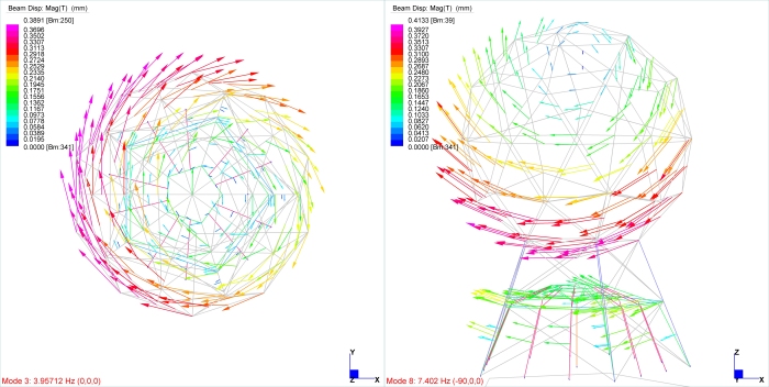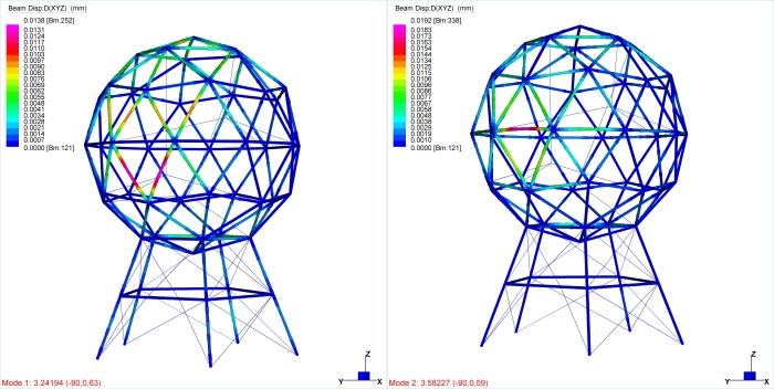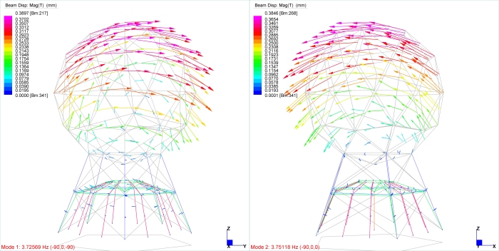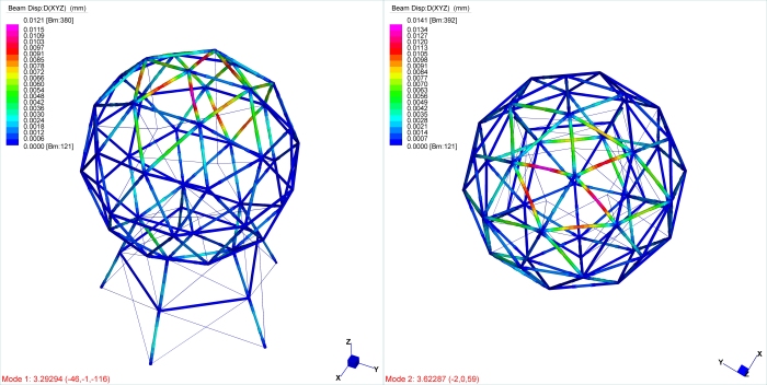 Figura 9 – Risultati dell’analisi di buckling. Deformate delle forme instabili delle aste della sfera geodetica.