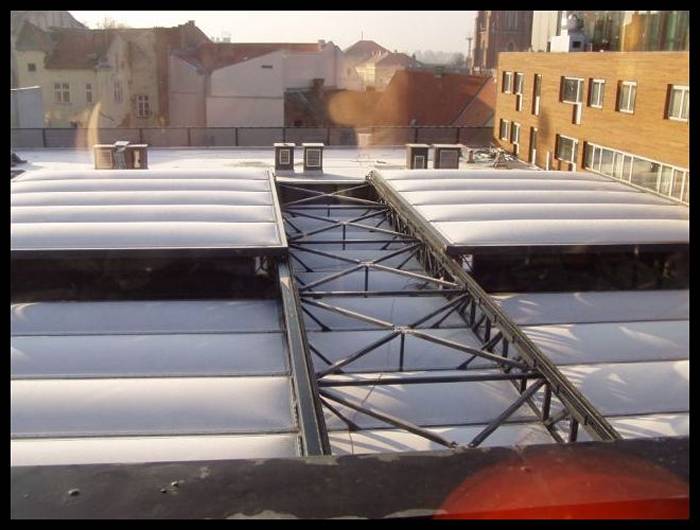 The primary elements of the roof structure are 1.1m high steel trusses spanning 29.5 m. On one side, the roof structure rests on a concrete parapet at the 2nd floor of a building and on the other side at the ground level. The distance between the main trusses are 10.4 m and 4.5 m respectively. Secondary beam are connecting the trusses. The roof is covered with 3-skin ETFE cushions. The cushions are fixed on the top of the primary and secondary steel structure.
