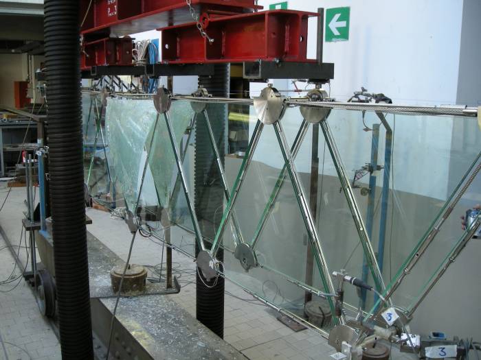 Sono state svolte analisi parametriche per valutare l’influenza della forza di pretensione dei cavi sul comportamento meccanico della trave, analisi di stabilità locale delle lastre di vetro ed analisi di stabilità flessotorsionale globale della trave, mettendo in conto imperfezioni di carattere geometrico e meccanico.