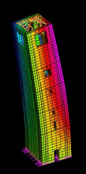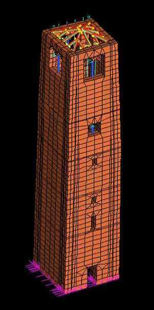 Per lo studio degli effetti delle forze orizzontali dovute all’oscillazione delle campane è stato realizzato un modello agli elementi finiti tridimensionale del campanile con elementi Brick simulanti la muratura e con elementi Beam rappresentanti la struttura in legno che sorregge le campane stesse.